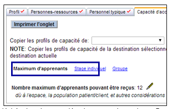 Le premier lien "Maximum d'apprenants" vous permet d'entrer un nombre d'étudiants pouvant être accueillis pour toutes les disciplines en tenant compte de l'espace et d'autres limitations. Deux liens additionnels permettent d'entrer un profil de capacité pour des stages individuels ou de groupe. Chaque profil de capacité d'accueil est rempli à l'aide d'un assistant étape-par-étape qui vous guide dans ce processus.