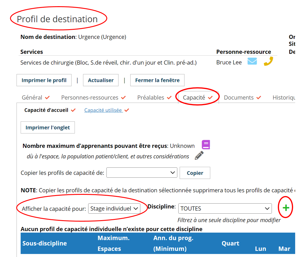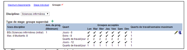 - Capacité – indique le type de personnel par discipline, quart et disposition à accueillir des étudiants (