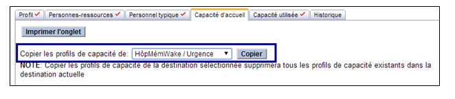 NOTE: Lorsque vous désirez ajouter ou éditer un profil de capacité, vous pouvez copier les résultats de l'assistant pour une autre destination en sélectionnant celle-ci dans le menu déroulant :