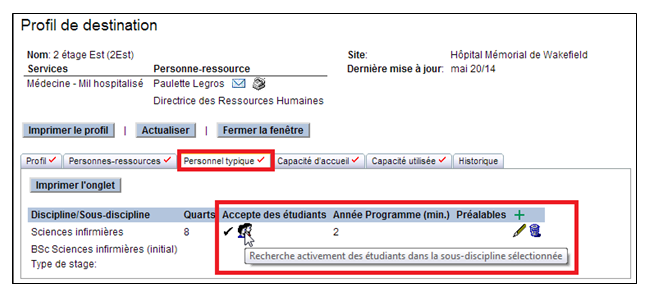 Personnel typiqueCapacité – indique le type de personnel par discipline, quart et disposition à accueillir des étudiants ( ). Une case à cocher est également disponible pour signaler que la destination recherche activement des étudiants pour une sous-discipline spécifique, et une icône supplémentaire est affichée si cette option est sauvegardée :