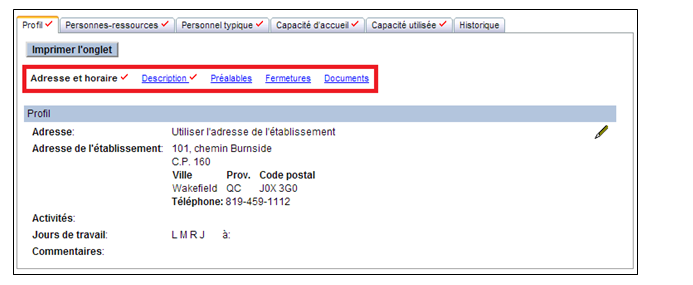 ProfilGénéral – entrer l'adresse de la destination (si différente de celle du site), description du programme, populations desservies, lits ou activités, heures d'ouvertures et prochaines fermetures.