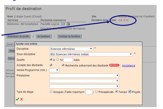 Chaque destination possède un profil d'information en ligne pour assister la coordination des stages. Le profil est accessible aux utilisateurs et peut être mis à jour par le coordonateur receveur ou l'agent de destination, ou par le coordonateurcoordonnateur demandeur si le service ou la destination n'utilise pas HSPnet.