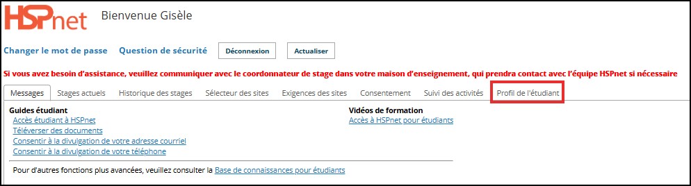 L'écran de bienvenue de l'étudiant.e comporte plusieurs onglets correspondant aux fonctions qui, pour la plupart, lui sont accessibles en lecture seule. Les coordonnateurs demandeurs administrateurs locaux peuvent modifier le profil du programme pour permettre aux étudiant.e.s de consulter certaines pages de leur propre profil. |