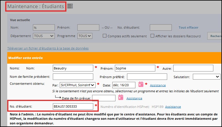 Le numéro d'étudiant (code permanent) n'est pas divulgué pour les étudiants entrés avec seulement leurs initiales dans HSPnet, car les initiales indiquent que l'étudiant n'a pas consenti à la divulgation de ses données aux sites receveurs. |