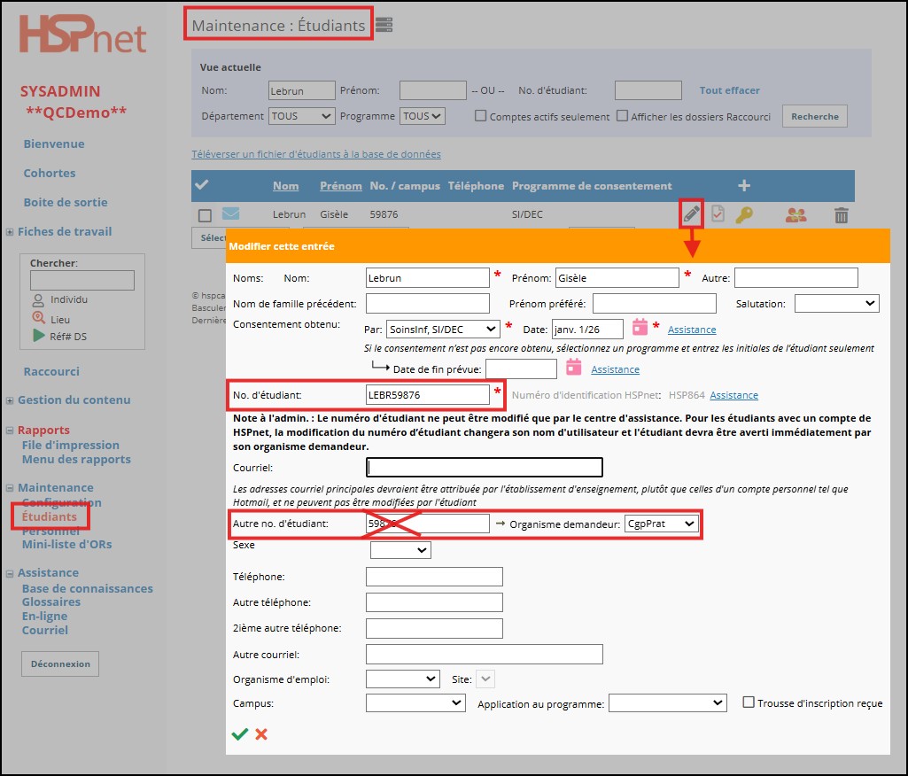 Le numéro d'étudiant (code permanent) n'est pas divulgué pour les étudiants entrés avec seulement leurs initiales dans HSPnet, car les initiales indiquent que l'étudiant n'a pas consenti à la divulgation de ses données aux sites receveurs. |