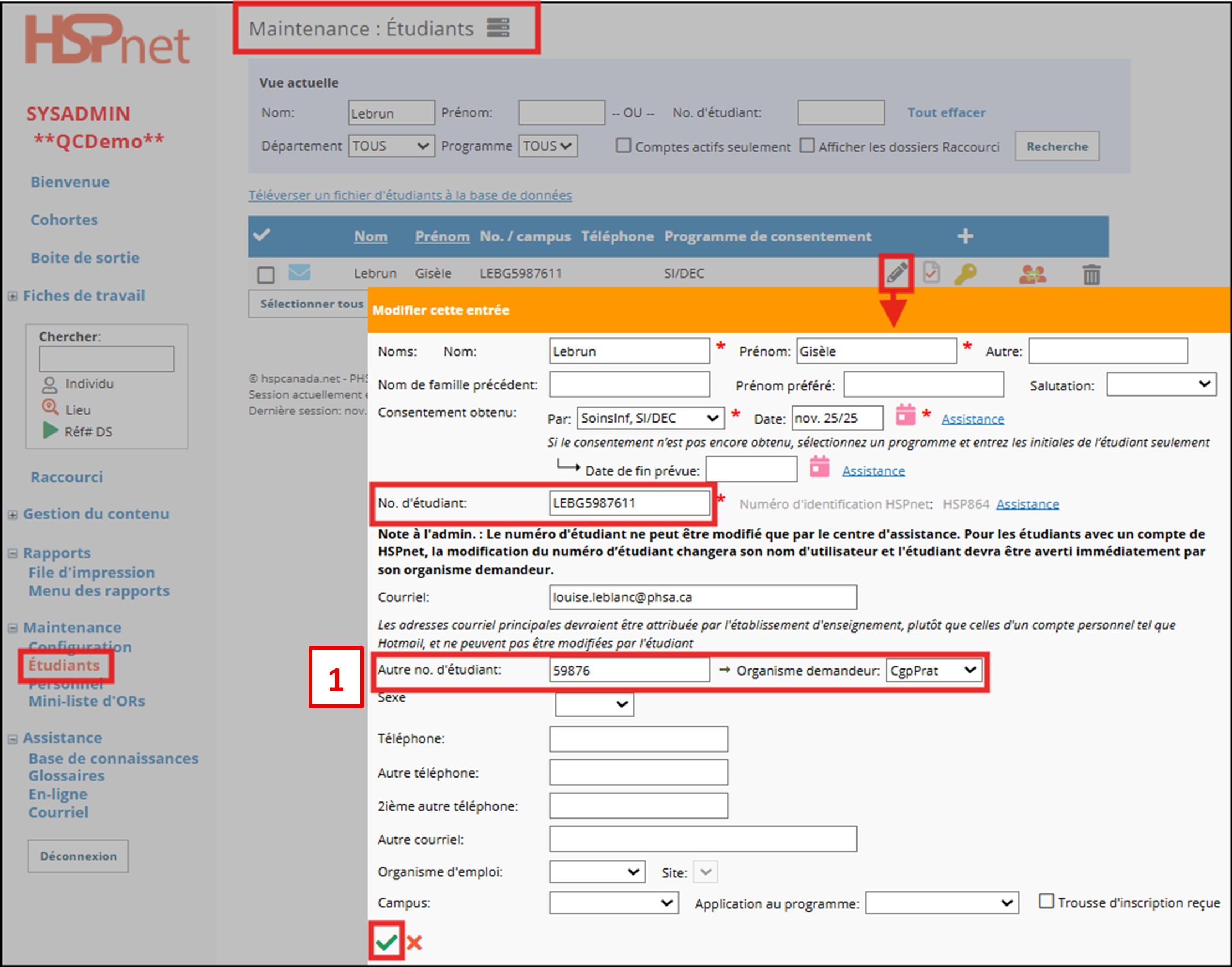 Pour les organismes demandeursSi vous désirez rendre le code permanent de l'étudiant.e disponible vous devez utiliser le champ No. d'étudiant dans l'écran Maintenance : Étudiants pour chaque registre d'étudiant.e.