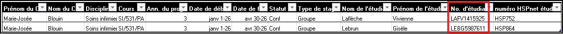 Le numéro d'étudiant (code permanent) n'est pas divulgué pour les étudiant.e.s entré.e.s avec seulement leurs initiales dans HSPnet, car les initiales indiquent que l'étudiant.e n'a pas consenti à la divulgation de ses données aux sites receveurs. De plus, il ne peut être modifié, si vous avez fait une erreur vous devez contacter le bureau d'assistance pour la corriger. |