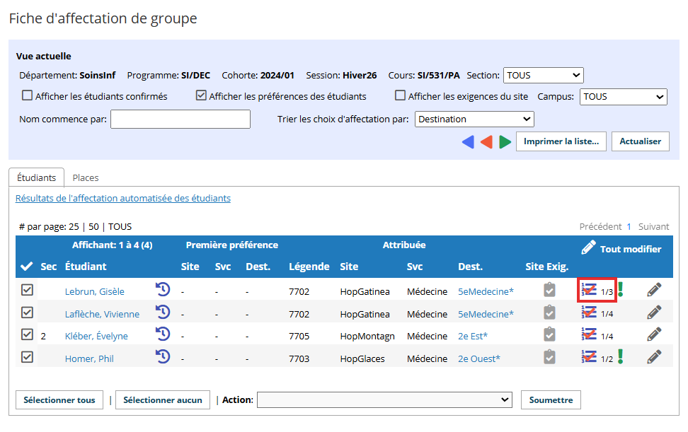 9. Fermez la fenêtre pour actualiser la fiche d'affectation et afficher les affectations suggérées. Les étudiants jumelés avec succès ont une icône « affectation automatisée » (qui peut être cliquée pour afficher les choix des étudiants).