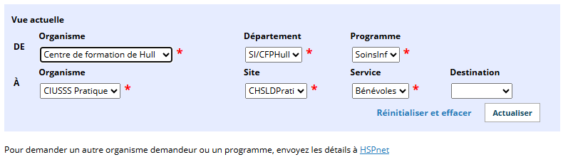 NOTE – Cliquez HSPnet pour demander par courriel l’ajout de l’établissement d’enseignement ou du programme qui n’est pas encore disponible dans les listes déroulantes.